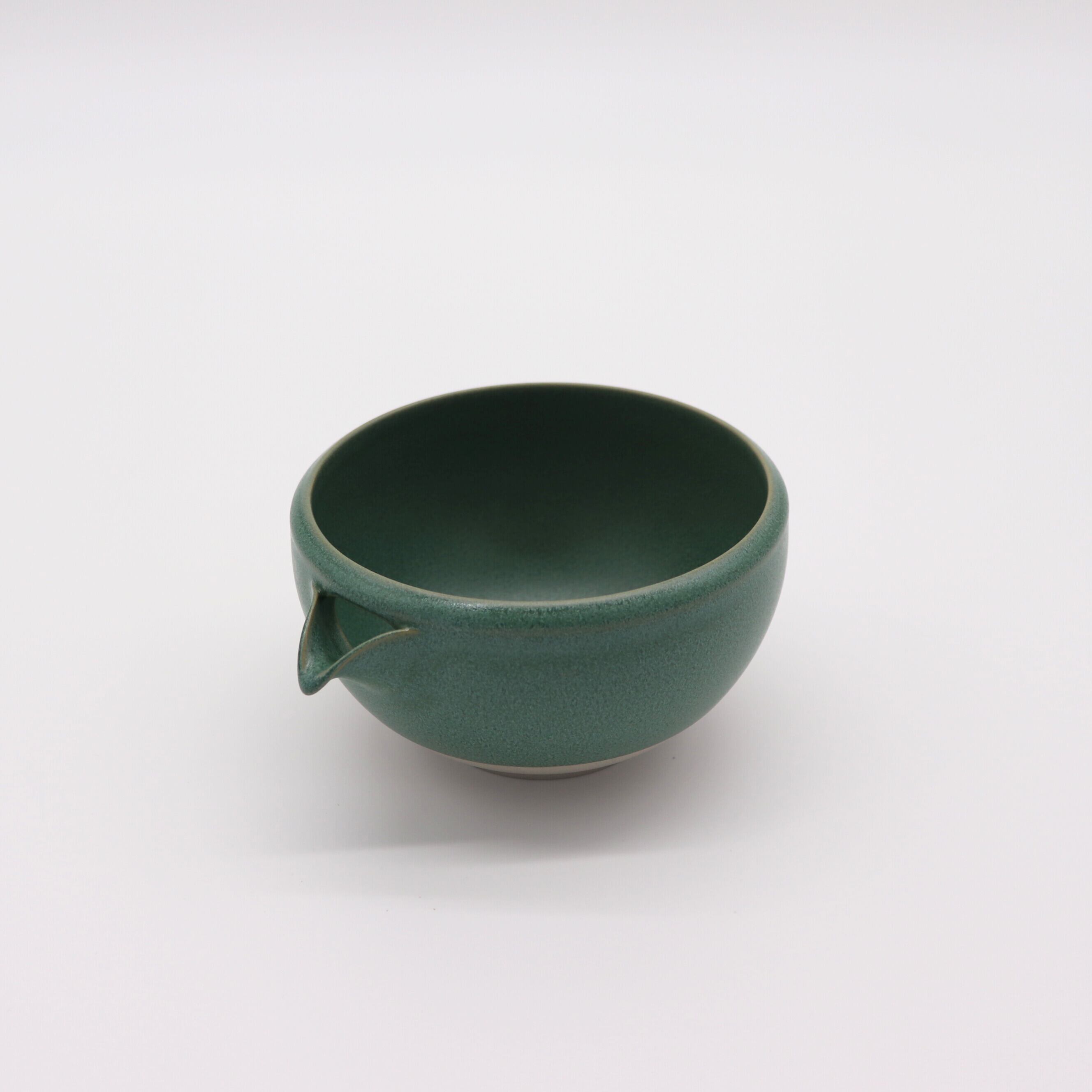これまでの「片口抹茶碗」の流れを受け継ぎつつ、フォルムは丸みを帯び、縁まで丁寧に施された釉薬により、クラフト感あふれる佇まいに。注ぎ口も何度も改良され、液だれしにくく、抹茶を最後の一滴まで美しく注ぎきることができます。